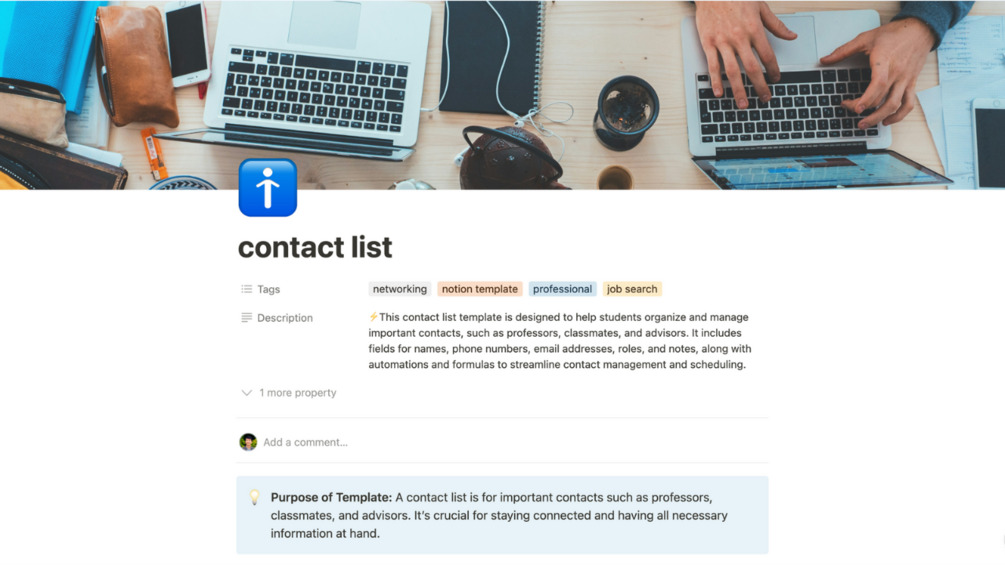 ⚡️This contact list template is designed to help students organize and manage important contacts, such as professors, classmates, and advisors. It includes fields for names, phone numbers, email addresses, roles, and notes, along with automations and formulas to streamline contact management and scheduling.