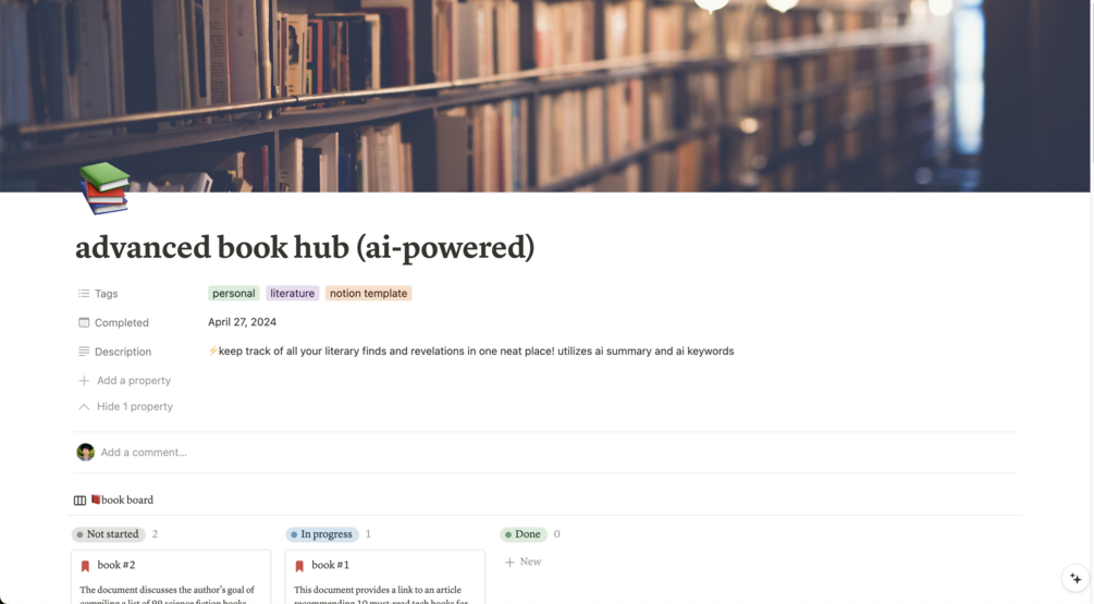 Discover the power of this advanced AI-powered book hub. This comprehensive solution gives you the ultimate control over your literary journey. Track your reading, organize your thoughts, and delve deeper into your favorite books. Notion's state-of-the-art AI technology provides succinct summaries and identifies key themes, enriching your reading experience. This tool is perfect for literature enthusiasts, students, and book clubs. Invest in your reading adventure today with this Notion template.